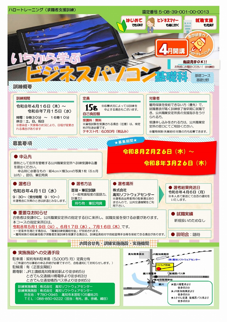 求職者支援訓練 いちから学ぶ ビジネスパソコン基礎科 募集開始いたしました!(2023年06月06日まで)